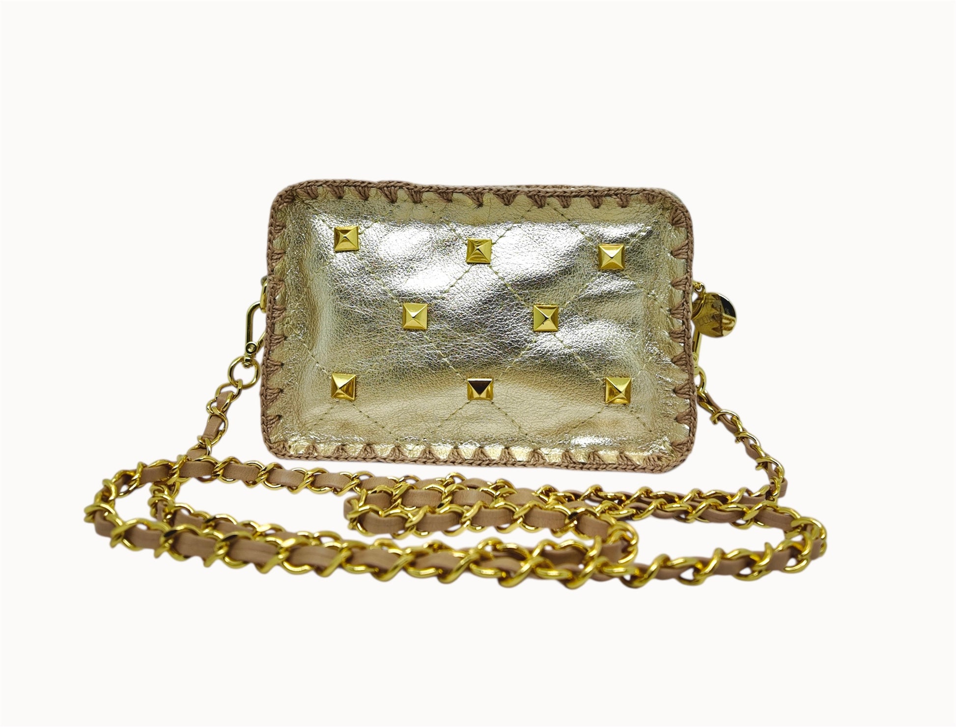 Bolsa Vick Spike, feita artesanalmente em couro legítimo, com aplicações de spikes dourados, acabamento em crochê. Possui fechamento com zíper e forro interno com bolso.